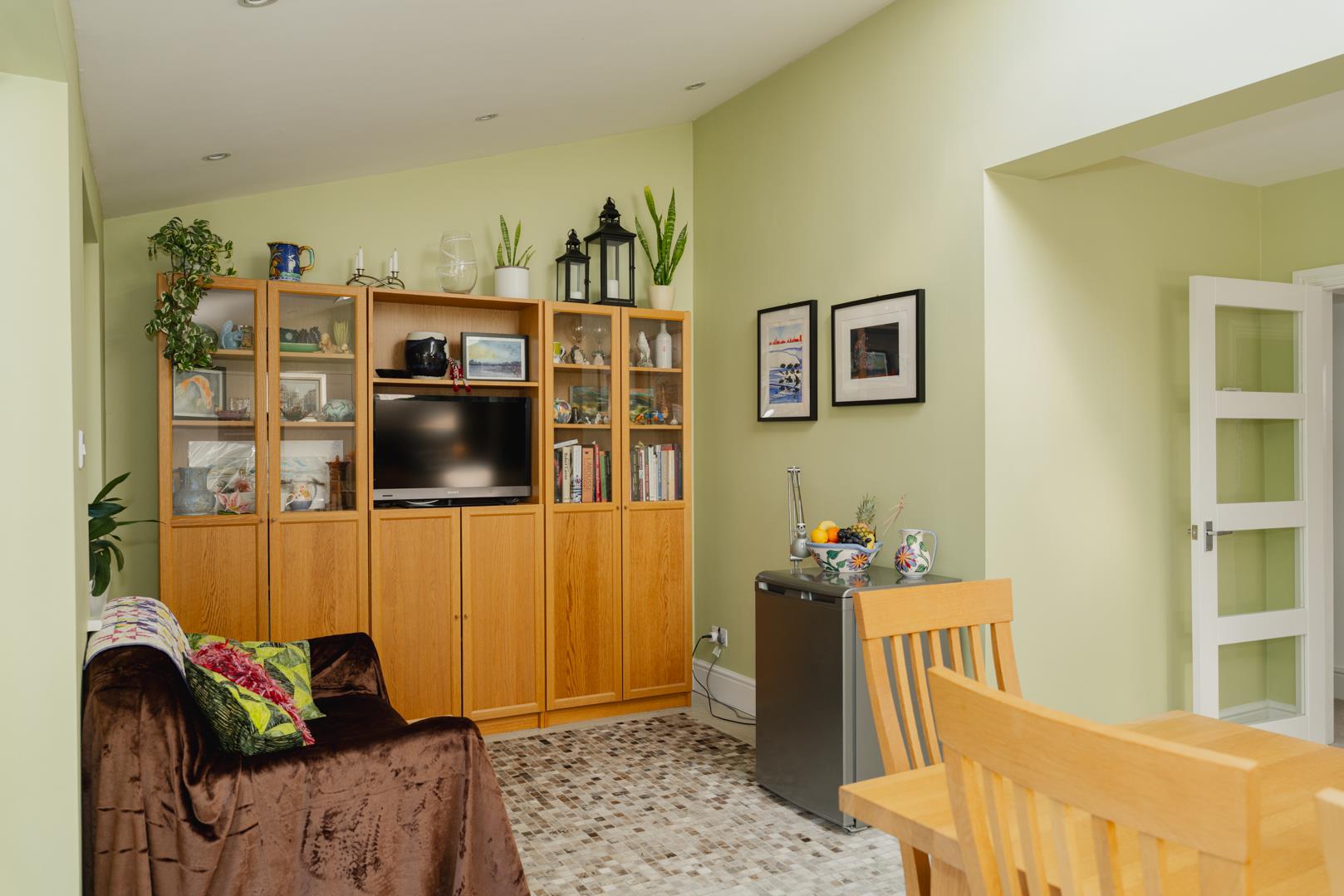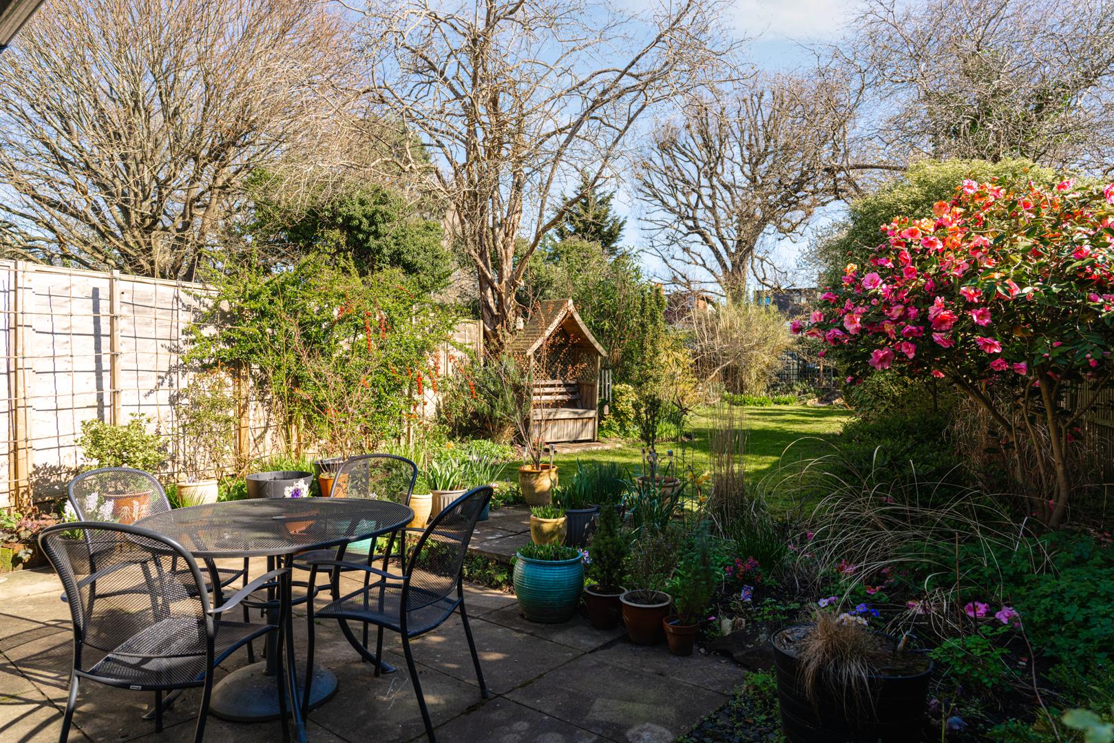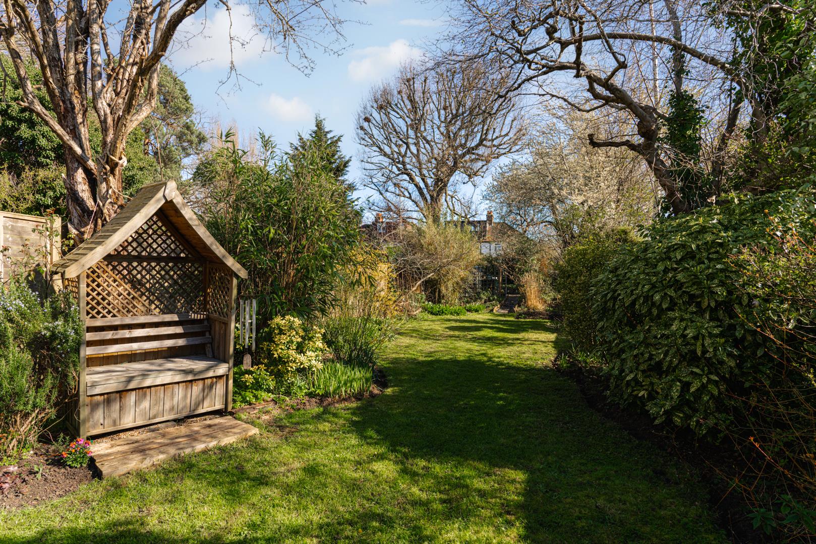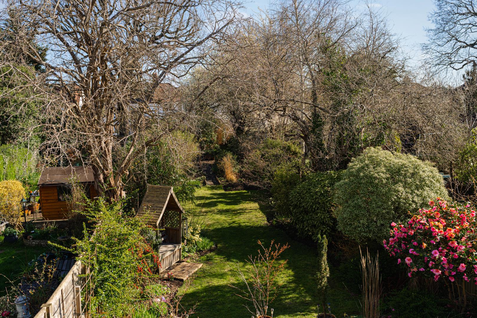 The rear garden has been beautifully established over decades, featuring a paved patio, a good-sized lawn, and a covered bench from which to enjoy the wide variety of flowers, shrubs, and trees. To the front, there is an integral garage and off-street parking that comfortably fits two cars.