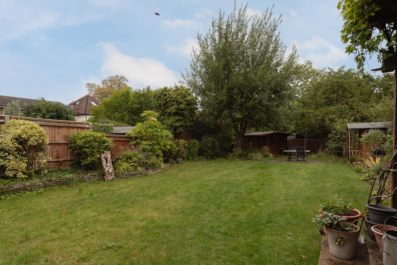 The rear garden has been beautifully established over the decades and includes an elevated patio area, a large lawn section, mature planted boarders, two summer houses, a rear patio seating area and side access to the front.