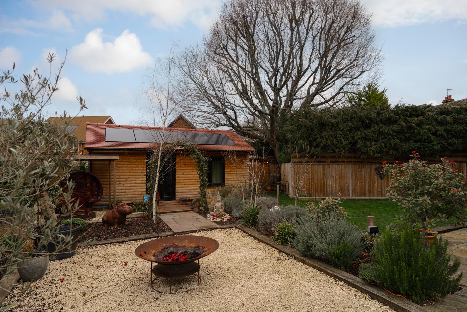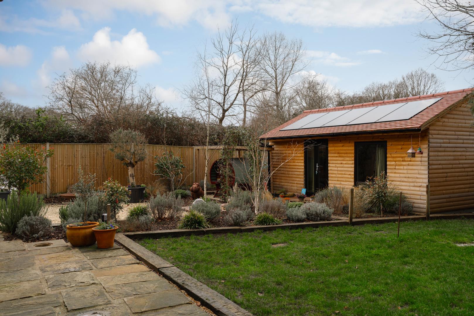Outside, there is a beautifully landscaped wrap-around garden with a mix of lawn areas, sandstone paved patios, Cotswold stone-chipped sections, railway sleeper borders, and thoughtfully planted beds offering a pleasant selection of flora. The current owners have also erected a delightful timber outbuilding, currently functioning as a holistic and wellbeing centre; however, this could be tailored to your own individual needs. Solar panels have been added to contribute to this home’s "B" rating on the Energy Performance Certificate, making it exceptionally energy efficient.